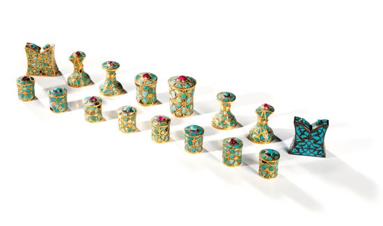 Satranç takımı, ajur ve firuzekârî tekniğiyle yapılmış çeşitli motiflerle bezenmiştir. Tepelerinde altın yuvalı kabaşon yakut veya firuze taşlar vardır. Taşlardan dokuzunun tepesi yakutlu, altısı firuzelidir. Satranç takımlarının 16. yüzyıldan günümüze ulaşabilmiş küçük, zarif parçalarının birbirine benzeyenleriyle bir yarım set oluşturulmuştur.